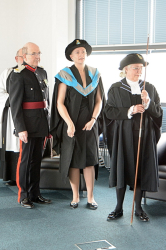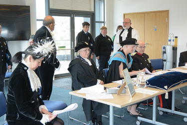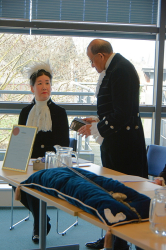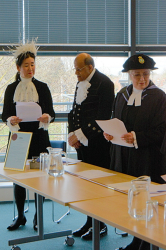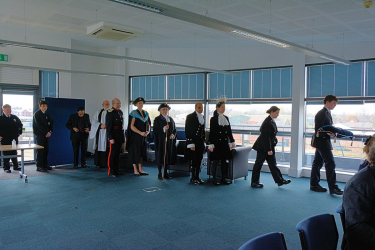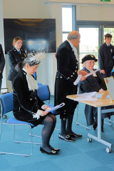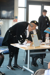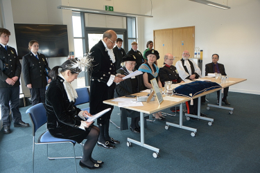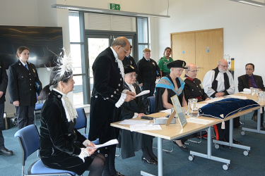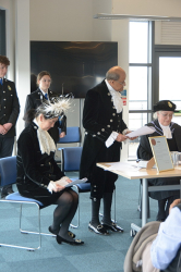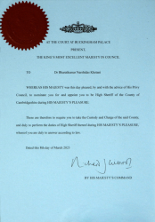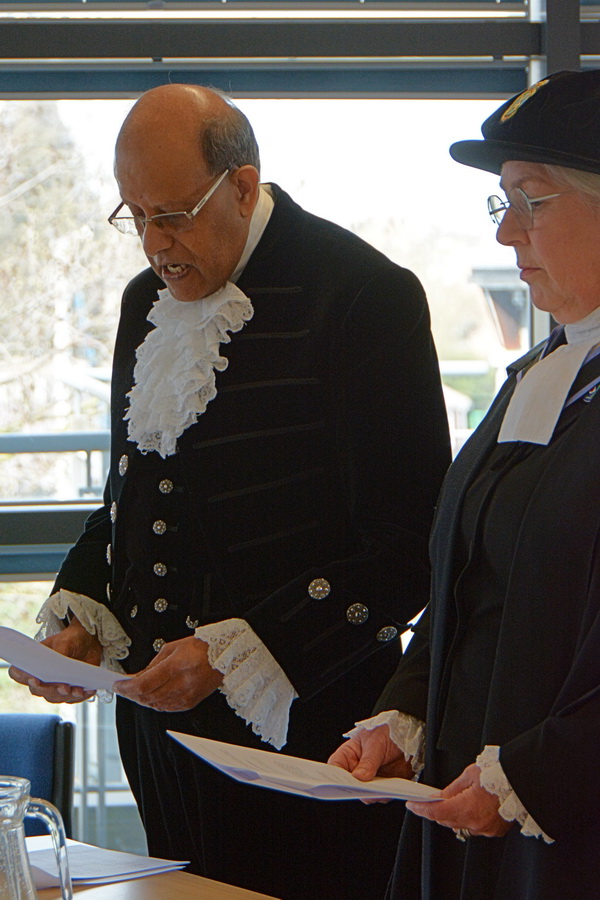 The current High Sheriff Mrs Jennifer Crompton hands over to the new High Sheriff Dr. Bharatkumar Narshidas Khetani at a ceremony held in Wisbech Cambridgeshire. In addition retiring Under Sheriff Caroline Stenner handed over Alex Schaafsma as the new Under Sheriff.