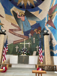 The Cambridge American Cemetery contains the remains of 3,811 U.S. dead from World War II, with another 5,127 names recorded on the Walls of the Missing. The 30-acre site lies on a slope with the western and southern sides framed by woodland. From the flagpole platform near the main entrance, the great mall with its reflecting pools stretches eastward. At the far end is the memorial with a chapel, featuring two huge military maps, stained glass windows bearing the state seals and military decorations, and a mosaic ceiling memorial. A 4,000-square-foot center visitor center opened in May 2014.
